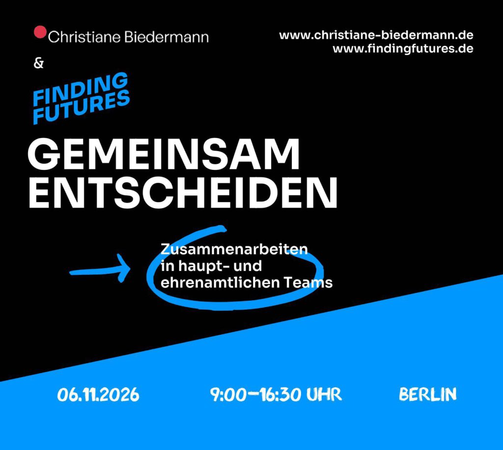 Wir arbeiten daran, wie Teams, vor allem gemischte Teams aus Haupt- und Ehrenamtlichen zu Entscheidungen kommen und wie sie Entscheidungen und Formen des Arbeitens finden, die ihnen genug Zeit für das lassen, worum es eigentlich geht.